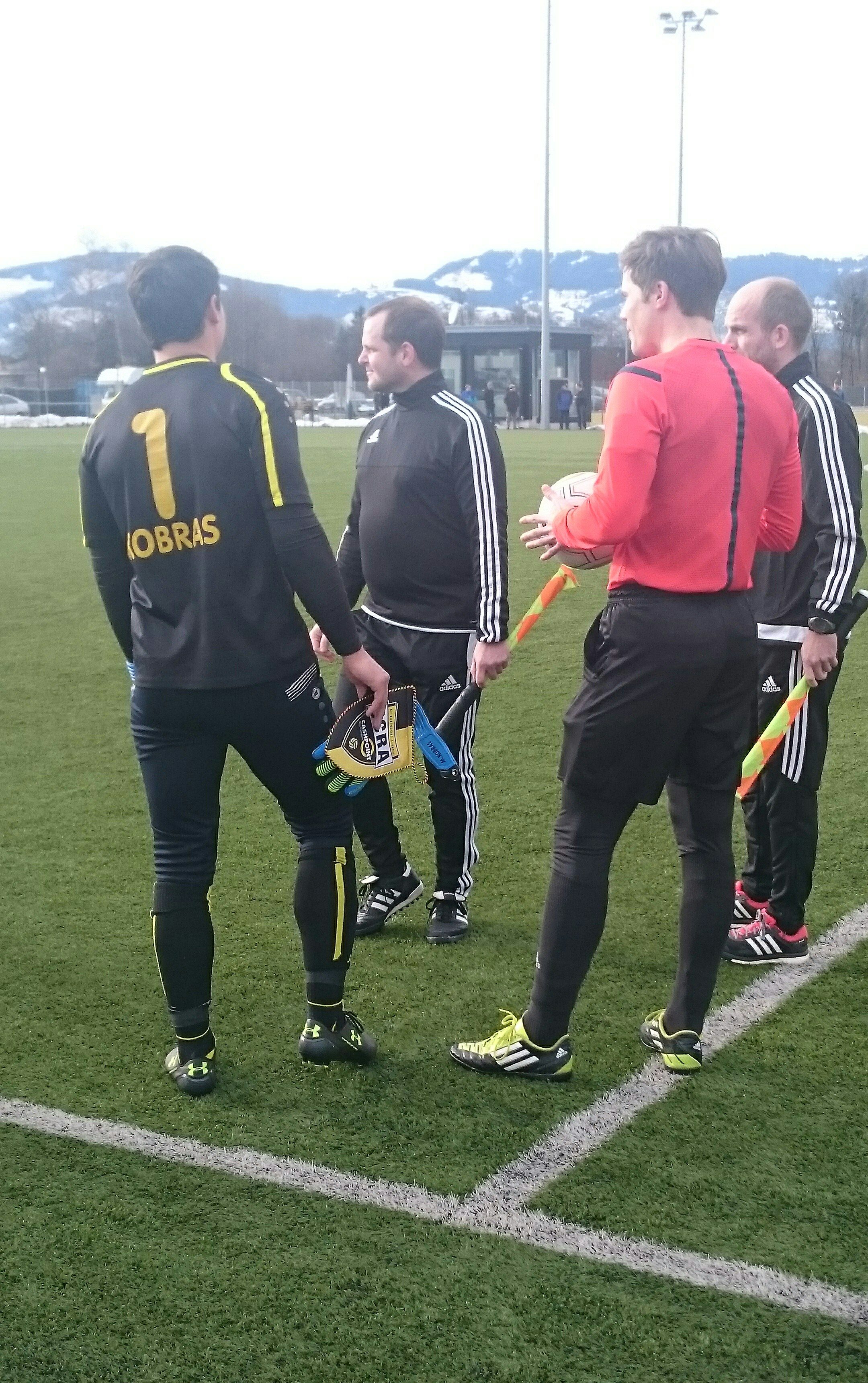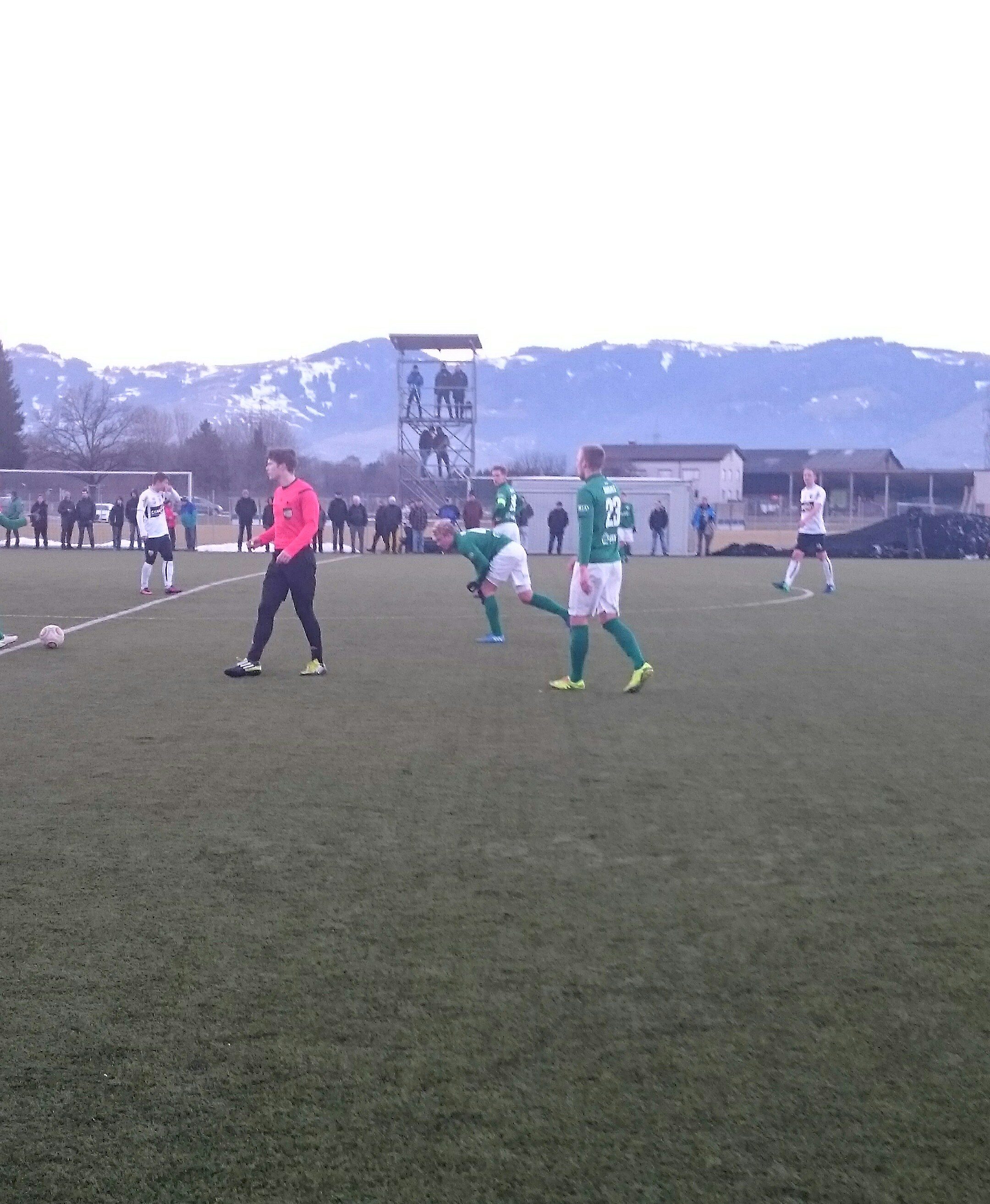 Если коротко описывать игру первого тайма, то первые минут 10 хозяева атаковали ворота Майта Тоома, но ребята не стушевались, выстояли и даже на 14 минуте создали опасный голевой момент, поумерив тем самым пыл хозяев поля. А голкипер СК «Рейндорф» Мартин Кобрас сорвал аплодисменты болельщиков, которых, к слову, оказалось порядка 100 – 150 человек, несмотря на рабочий день и три часа дня. Благо, погода оказалась футбольной — временами солнечно, +7, и неудобство в виде отсутствующих трибун и скамеек на тренировочном поле не стало преградой для болельщиков. Реальный же шанс хозяева упустили в первом тайме под занавес игры, но Сакич, к нашей радости, пробил чуть в сторону от ворот. 0:0 при большом количестве силовой борьбы на поле, но при отсутствии голевых ситуаций.