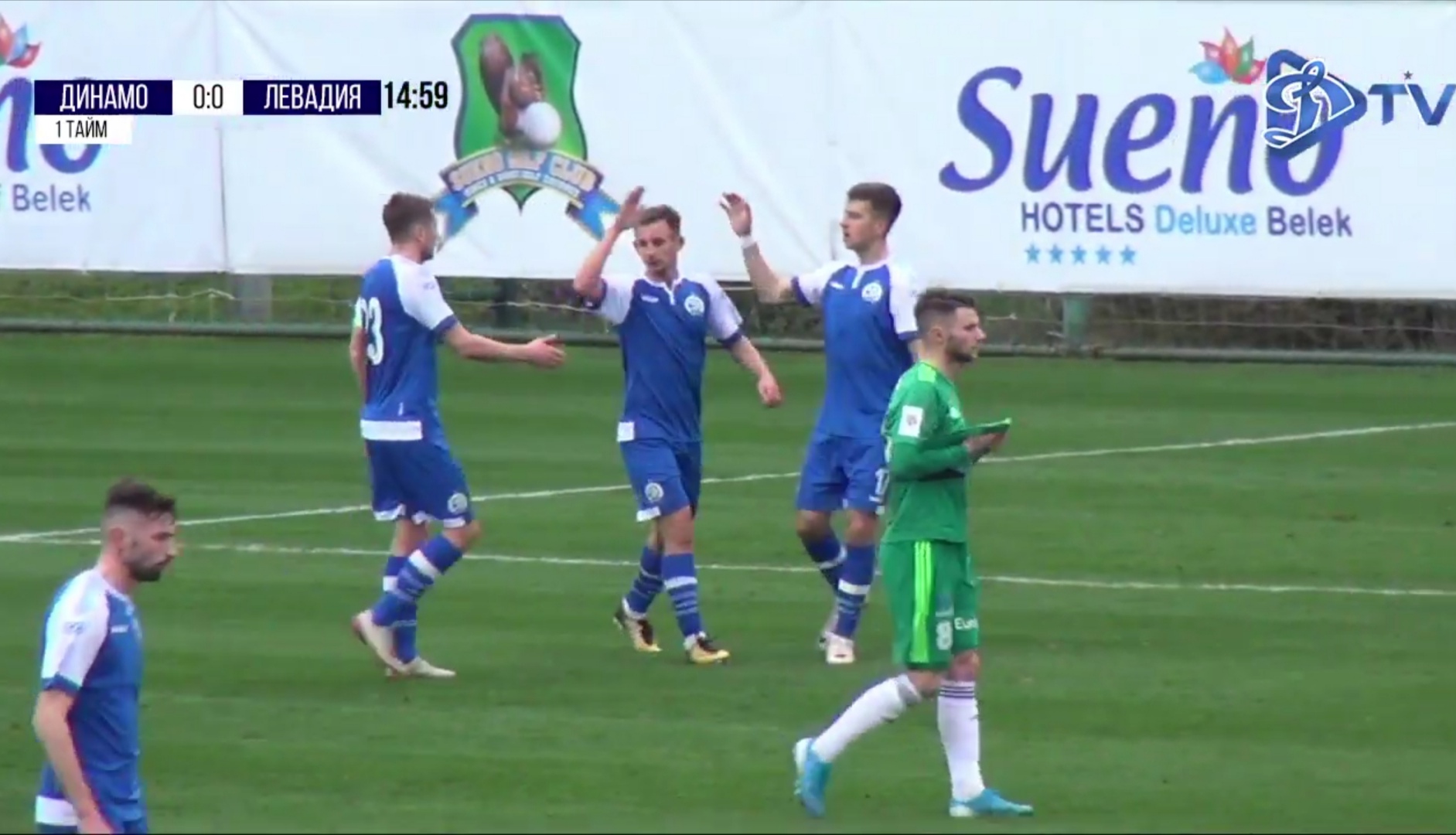 «Динамо» забивало точным ударом в ближний угол на 15 минуте, а «Левадия» ответила курьёзным голом в конце первого тайма, на 39 минуте. Артём Комлов воспользовался навесом в штрафную, удачно подправив головой летящий мяч.